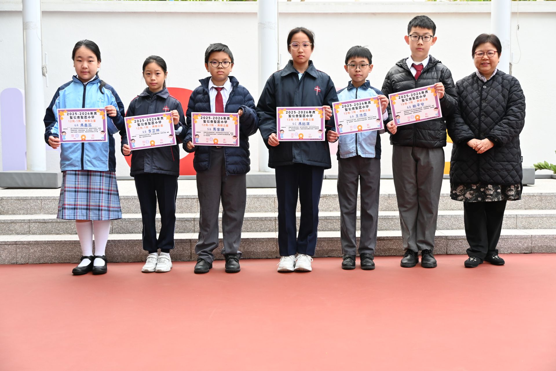 4A 馮鑫蕊 4B 李芷琳 5A 古翰語 5B 馬家謙 5C 馮鈺淇 6A 王浩霖 6B 鮑平安 6C 吳若晴